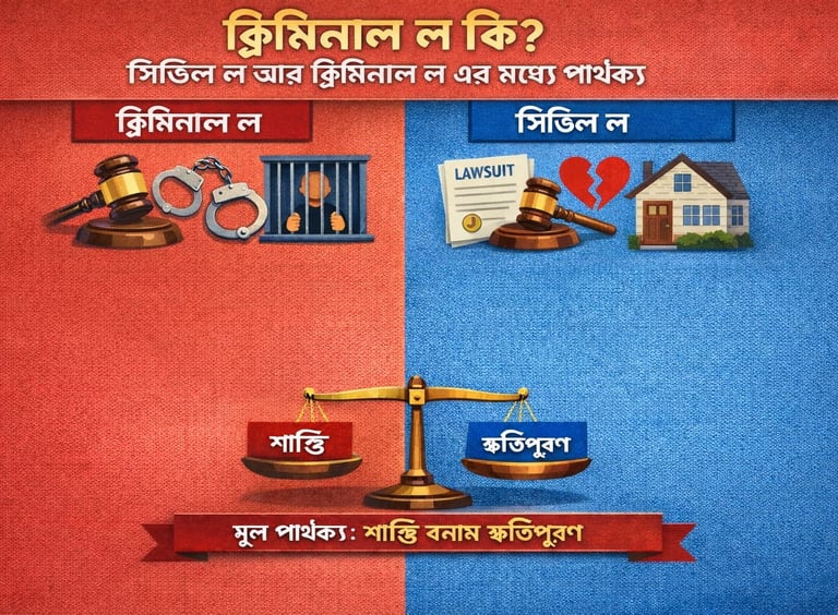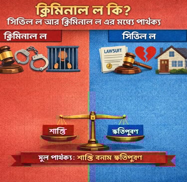 সিভিল ল (Civil Law) এবং ক্রিমিনাল ল (Criminal Law) আইন ব্যবস্থার দুটি গুরুত্বপূর্ণ শাখা, তবে এদের উদ্দেশ্য ও প্রয়োগ ভিন্ন।